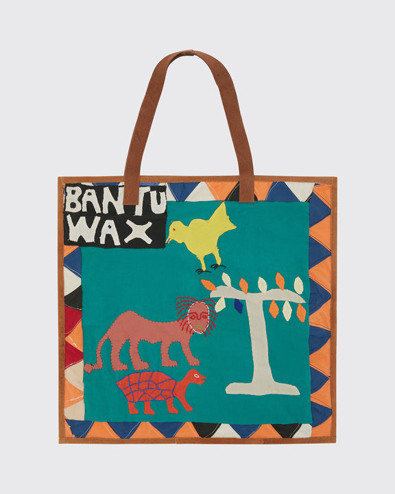Introducing our hand-sewn Asafo flag tote bag, a centuries-old craft still practiced today along the sun-drenched Cape Coast of Ghana. Bantu turned not to factory methods, but to three artisans in Ghana who make real Asafo with time-honoured modes of cotton cloth appliqué. Playing off of the customary characters and colours of classic Asafo flags, the blankets and totes feature a range of vibrant scenes and symbols, which will also be replicated across a series of screen-printed long-sleeve cotton tees and leather key chains, as well as be a recurring part of the Bantu universe going forward.