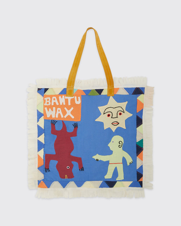 Introducing our hand-sewn Asafo flag tote bag, a centuries-old craft still practiced today along the sun-drenched Cape Coast of Ghana. Bantu turned not to factory methods, but to three artisans in Ghana who make real Asafo with time-honoured modes of cotton cloth appliqué. Playing off of the customary characters and colours of classic Asafo flags, the blankets and totes feature a range of vibrant scenes and symbols, which will also be replicated across a series of screen-printed long-sleeve cotton tees and leather key chains, as well as be a recurring part of the Bantu universe going forward.