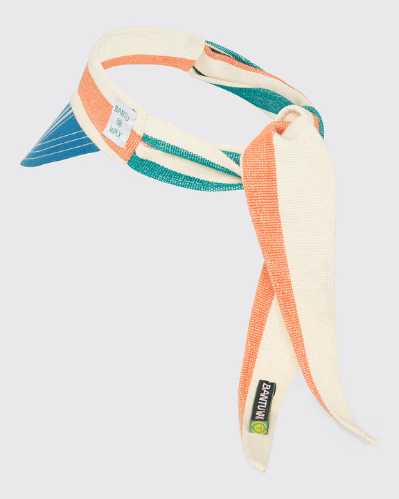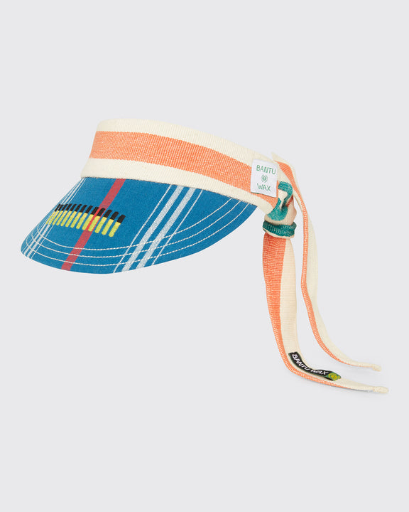 Our tie back visor with stitched logo on the side. Hand woven and assembled by artisans in Burkina Faso using local textiles and designs. Protecting you from the sun and hat hair, the Bantu Wax visors are playful, sporty and they keep your head and your fit cool.