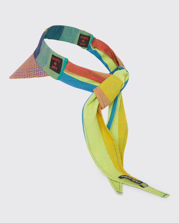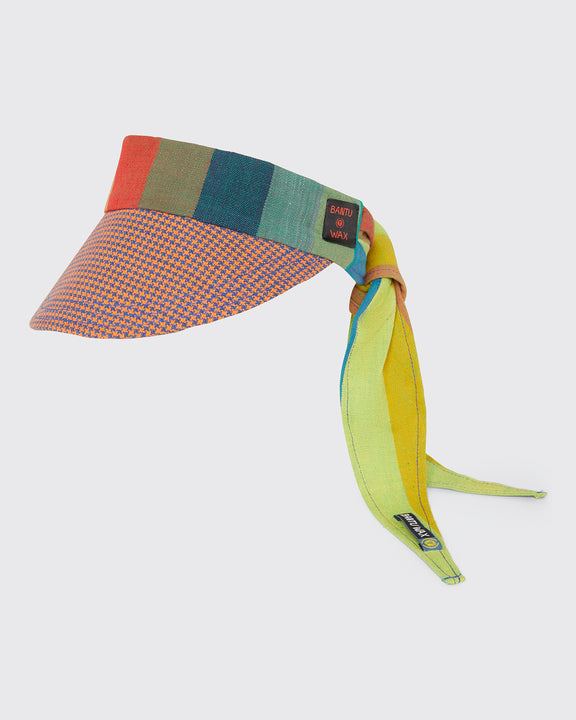 Our tie back visor with stitched logo on the side. Hand woven and assembled by artisans in Burkina Faso using local textiles and designs. Protecting you from the sun and hat hair, the Bantu Wax visors are playful, sporty and they keep your head and your fit cool.