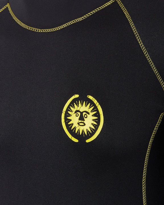 Black double nylon full body wetsuit with printed Bantu Wax logo on the sleeve and leg. Iconic sun logo on the chest. Designed with surfers in mind who seek comfort, functionality and performance in their wave-riding technical clothing.