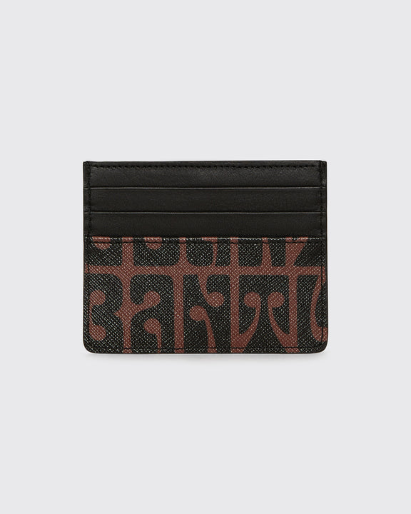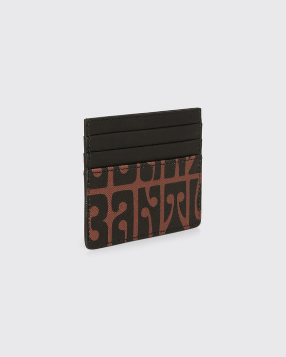 Brown and Black coated cotton canvas card wallet with a center compartment and three card slots for your credit cards, transport tickets and business cards. 4.3” x 2.8” x 0.6”. Made in Africa.