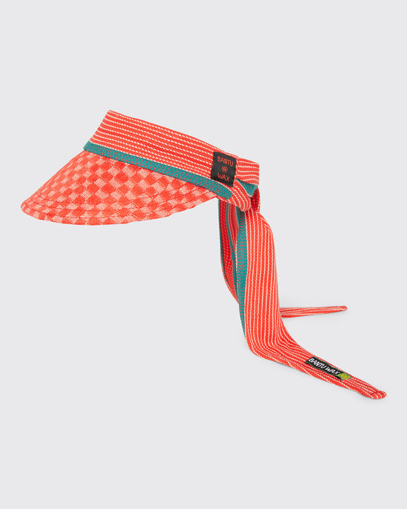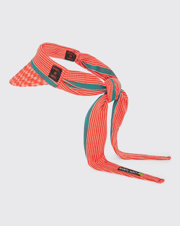 Our tie back visor with stitched logo on the side. Hand woven and assembled by artisans in Burkina Faso using local textiles and designs. Protecting you from the sun and hat hair, the Bantu Wax visors are playful, sporty and they keep your head and your fit cool.
