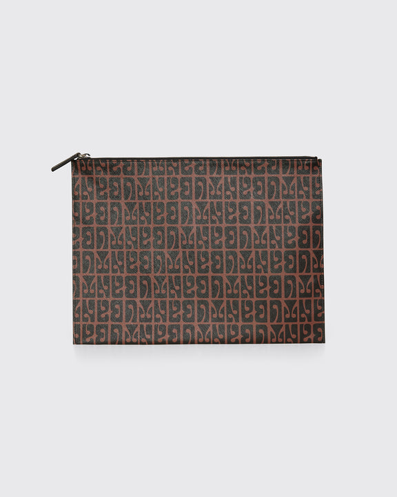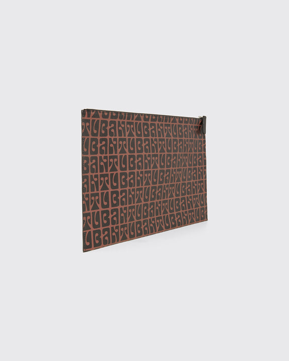 Brown and Black coated cotton canvas portfolio with zippered closure. 10.2” x 7.9” x 1”. Made in Africa.