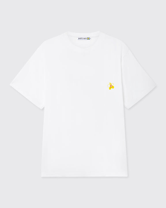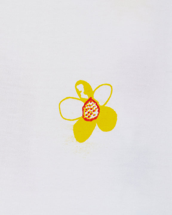 White short-sleeve tee with yellow flower embroidered on left chest. Printed graphic on reverse.