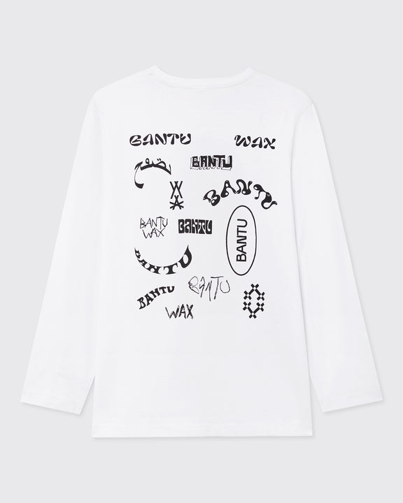 White long sleeve tee with printed Bantu logos on front and back. Just a great fit and tones of logos.