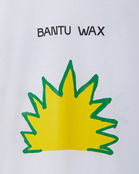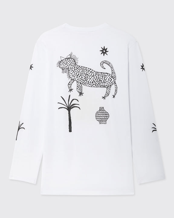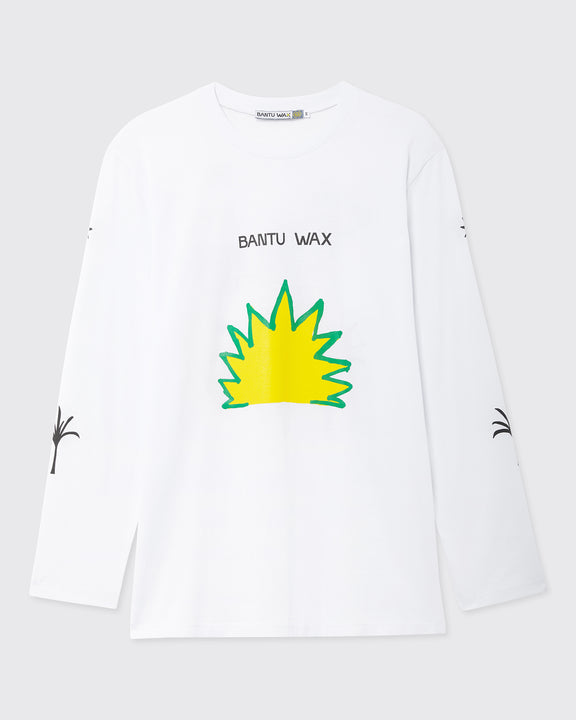White long sleeve tee with graphics on front, arms and back. A soft and breathable essential with a burst of energy from prints inspired by Senufo iconography. The Senufo people are deeply attached to their ancestral practices, and use masks and sculptures depicting animals and natural elements to communicate with spirits.